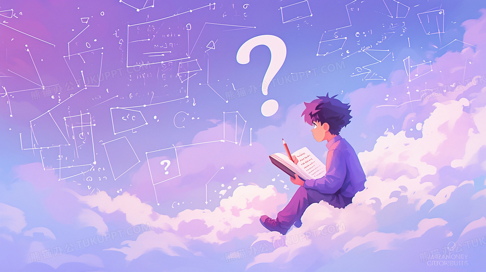 本作品内容为唯美梦幻坐云层上思考问题的男孩卡通背景, 格式为 jpg, 大小2 MB, 图片尺寸为2912 x 1632, 作品中背景图片无需修改, 源文件无水印,可以直接使用, 欢迎使用熊猫办公。 如认为平台内容涉嫌侵权,可通过邮件:tousu@tukuppt.com提出书面通知,我们将及时处理。