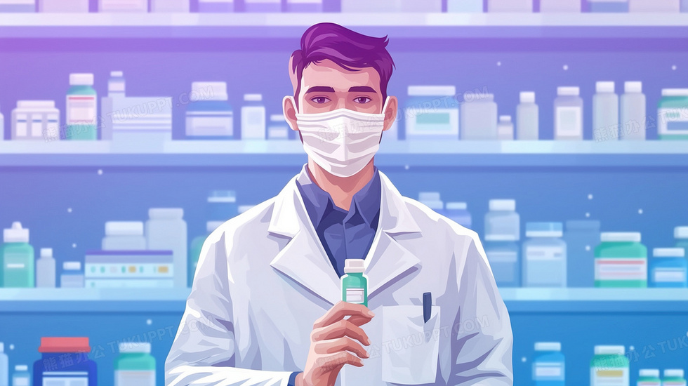 本作品内容为戴口罩男医生正在药房配药插画, 格式为 jpg, 大小2 MB, 图片尺寸为2912 x 1632, 源文件无水印, 欢迎使用熊猫办公。 如认为平台内容涉嫌侵权,可通过邮件:tousu@tukuppt.com提出书面通知,我们将及时处理。