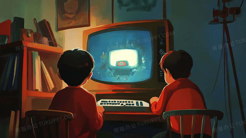 本作品内容为房间内玩电脑的两个男孩手绘插画, 格式为 jpg, 大小3 MB, 图片尺寸为2912 x 1632, 源文件无水印, 欢迎使用熊猫办公。 如认为平台内容涉嫌侵权,可通过邮件:tousu@tukuppt.com提出书面通知,我们将及时处理。