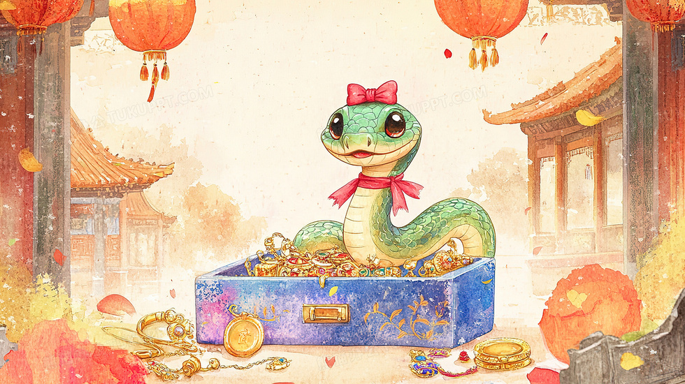 本作品内容为水墨百宝箱和蝴蝶结绿蛇创意插画, 格式为 jpg, 大小5 MB, 图片尺寸为2912 x 1632, 源文件无水印, 欢迎使用熊猫办公。 如认为平台内容涉嫌侵权,可通过邮件:tousu@tukuppt.com提出书面通知,我们将及时处理。