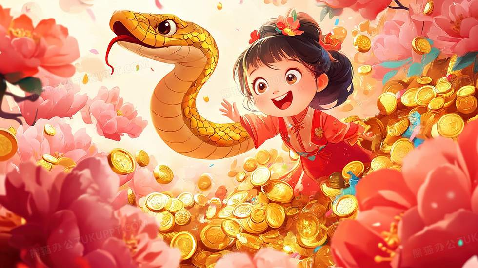 本作品内容为蛇年牡丹花金币与蛇卡通女孩插画, 格式为 jpg, 大小3 MB, 图片尺寸为2912 x 1632, 源文件无水印, 欢迎使用熊猫办公。 如认为平台内容涉嫌侵权,可通过邮件:tousu@tukuppt.com提出书面通知,我们将及时处理。