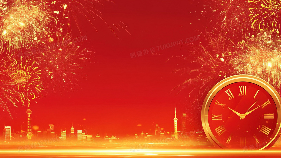 本作品内容为红金色新年钟表倒计时烟花背景, 格式为 jpg, 大小3 MB, 图片尺寸为2912 x 1632, 作品中背景图片无需修改, 源文件无水印,可以直接使用, 欢迎使用熊猫办公。 如认为平台内容涉嫌侵权,可通过邮件:tousu@tukuppt.com提出书面通知,我们将及时处理。