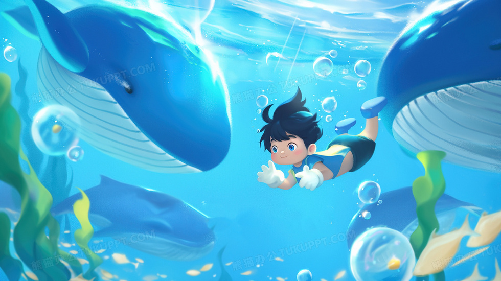 本作品内容为海底潜水卡通男孩与鲸鱼插画, 格式为 jpg, 大小3 MB, 图片尺寸为2912 x 1632, 源文件无水印, 欢迎使用熊猫办公。 如认为平台内容涉嫌侵权,可通过邮件:tousu@tukuppt.com提出书面通知,我们将及时处理。