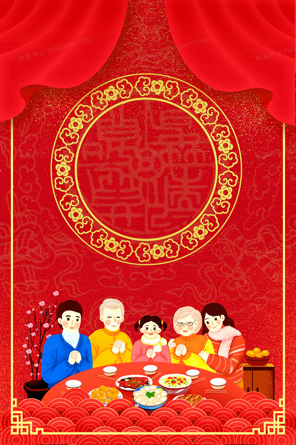 本作品内容为红金喜庆中国风新年年夜饭宣传背景, 格式为 psd, 大小288 MB, 图片尺寸为7087 x 10630, 作品中背景图片无需修改, 源文件无水印,可以直接使用, 欢迎使用熊猫办公。 如认为平台内容涉嫌侵权,可通过邮件:tousu@tukuppt.com提出书面通知,我们将及时处理。