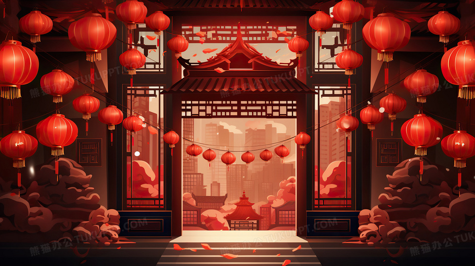 本作品内容为2024新年龙年喜庆国潮风中国建筑插画, 格式为 jpg, 大小6 MB, 图片尺寸为2912 x 1632, 源文件无水印, 欢迎使用熊猫办公。 如认为平台内容涉嫌侵权,可通过邮件:tousu@tukuppt.com提出书面通知,我们将及时处理。