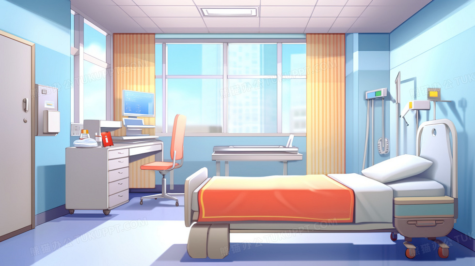 本作品内容为医院里明亮整洁的独立病房插画, 格式为 jpg, 大小4 MB, 图片尺寸为2912 x 1632, 源文件无水印, 欢迎使用熊猫办公。 如认为平台内容涉嫌侵权,可通过邮件:tousu@tukuppt.com提出书面通知,我们将及时处理。