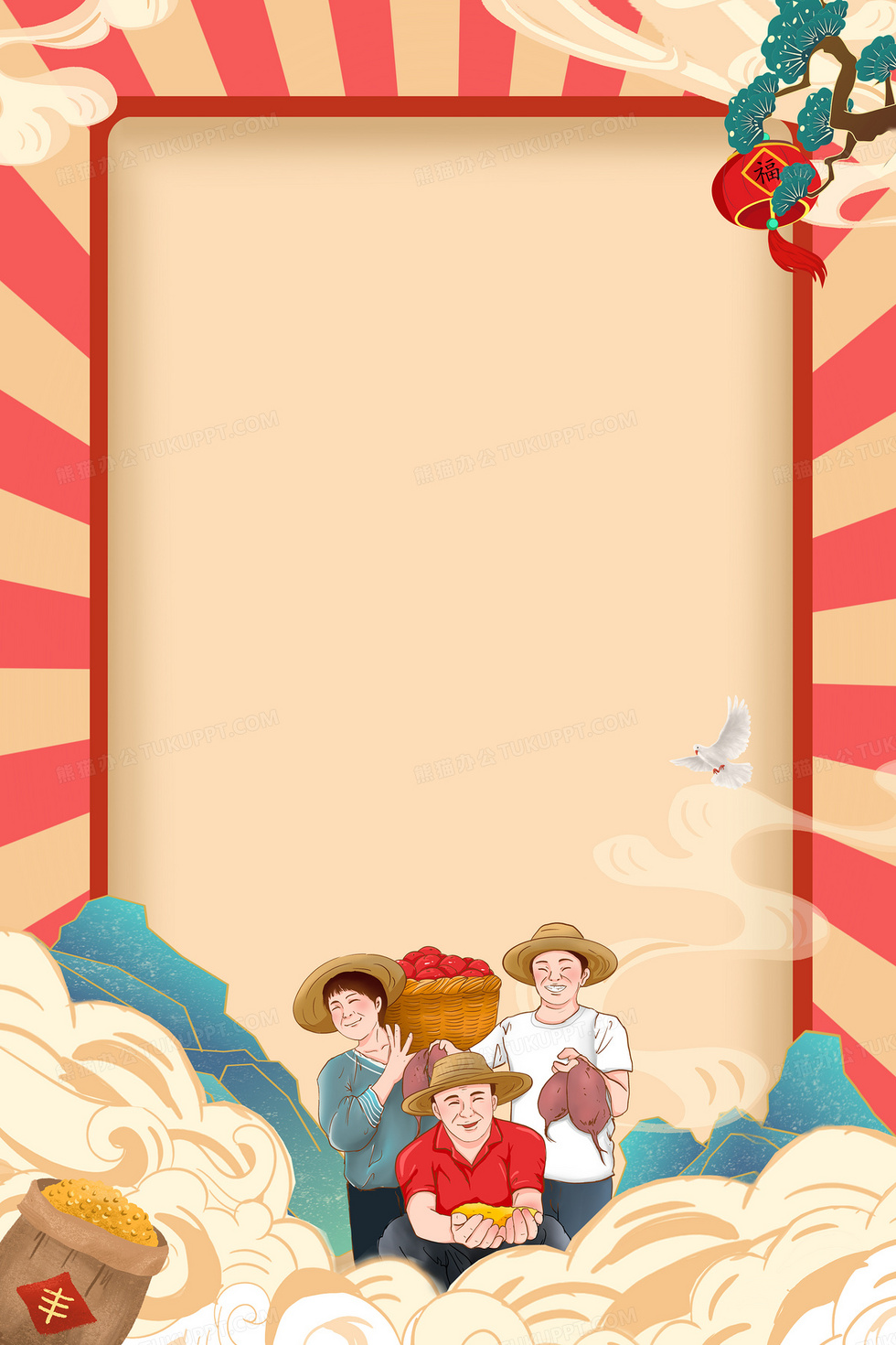 本作品内容为农民丰收季背景, 格式为 psd, 大小33 MB, 图片尺寸为3543 x 5314, 作品中背景图片无需修改, 源文件无水印,可以直接使用, 欢迎使用熊猫办公。 如认为平台内容涉嫌侵权,可通过邮件:tousu@tukuppt.com提出书面通知,我们将及时处理。
