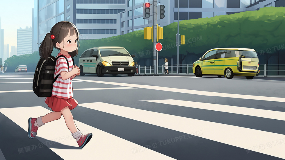 本作品内容为卡通可爱小女孩过斑马线插画, 格式为 jpg, 大小3 MB, 图片尺寸为2900 x 1632, 源文件无水印, 欢迎使用熊猫办公。 如认为平台内容涉嫌侵权,可通过邮件:tousu@tukuppt.com提出书面通知,我们将及时处理。