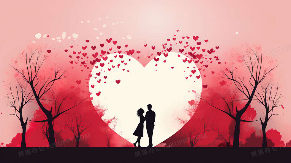 本作品内容为唯美粉色爱心情人节情侣剪影插画, 格式为 jpg, 大小5 MB, 图片尺寸为2912 x 1632, 源文件无水印, 欢迎使用熊猫办公。 如认为平台内容涉嫌侵权,可通过邮件:tousu@tukuppt.com提出书面通知,我们将及时处理。