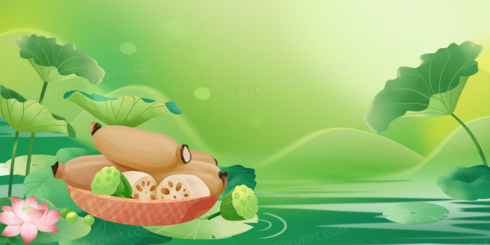 本作品内容为夏季绿色清新荷塘莲藕背景, 格式为 psd, 大小54 MB, 图片尺寸为4724 x 2362, 作品中背景图片无需修改, 源文件无水印,可以直接使用, 欢迎使用熊猫办公。 如认为平台内容涉嫌侵权,可通过邮件:tousu@tukuppt.com提出书面通知,我们将及时处理。