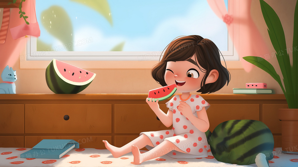 本作品内容为夏天女孩在卧室开空调吃西瓜插画, 格式为 jpg, 大小6 MB, 图片尺寸为2912 x 1632, 源文件无水印, 欢迎使用熊猫办公。 如认为平台内容涉嫌侵权,可通过邮件:tousu@tukuppt.com提出书面通知,我们将及时处理。