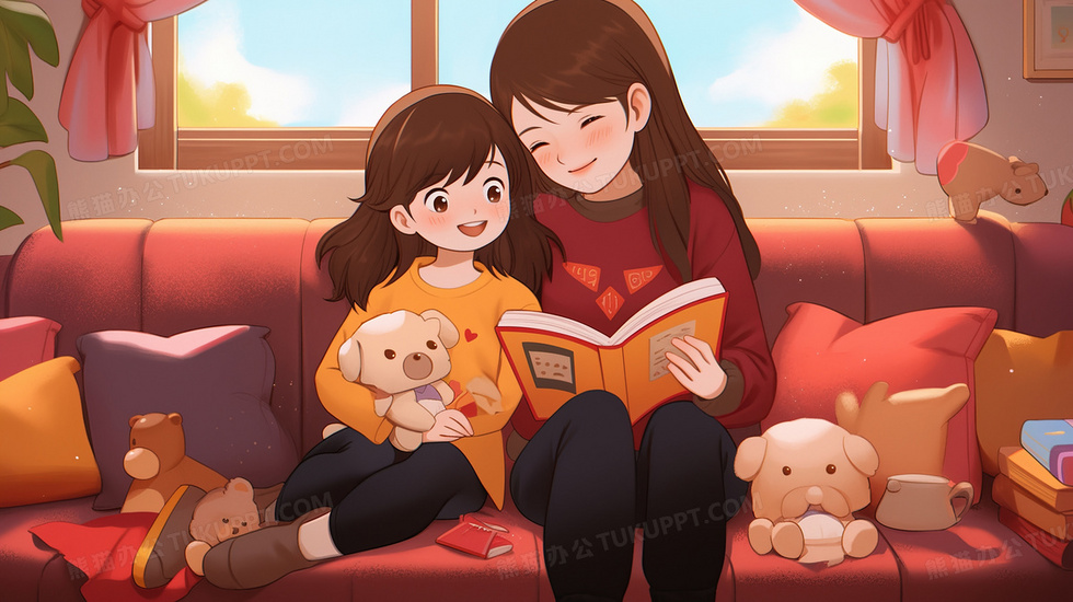 本作品内容为沙发上看书的母女插画, 格式为 jpg, 大小2 MB, 图片尺寸为2912 x 1632, 源文件无水印, 欢迎使用熊猫办公。 如认为平台内容涉嫌侵权,可通过邮件:tousu@tukuppt.com提出书面通知,我们将及时处理。