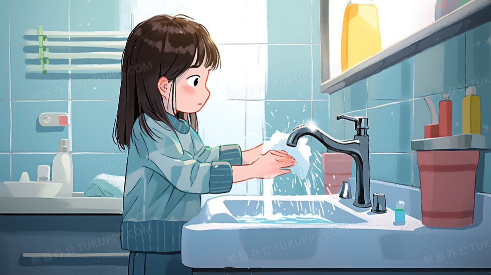 本作品内容为卡通风可爱的小女孩在洗手, 格式为 jpg, 大小3 MB, 图片尺寸为2912 x 1632, 源文件无水印, 欢迎使用熊猫办公。 如认为平台内容涉嫌侵权,可通过邮件:tousu@tukuppt.com提出书面通知,我们将及时处理。