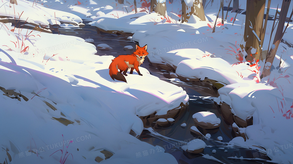 本作品内容为冬天雪地里小溪边美丽的红狐雪景插画, 格式为 jpg, 大小3 MB, 图片尺寸为2912 x 1632, 源文件无水印, 欢迎使用熊猫办公。 如认为平台内容涉嫌侵权,可通过邮件:tousu@tukuppt.com提出书面通知,我们将及时处理。