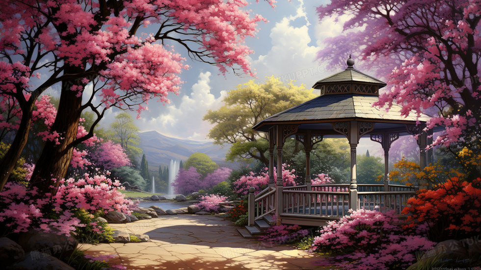本作品内容为水彩手绘春天庭院亭子花树风景插画, 格式为 jpg, 大小8 MB, 图片尺寸为2912 x 1632, 源文件无水印, 欢迎使用熊猫办公。 如认为平台内容涉嫌侵权,可通过邮件:tousu@tukuppt.com提出书面通知,我们将及时处理。
