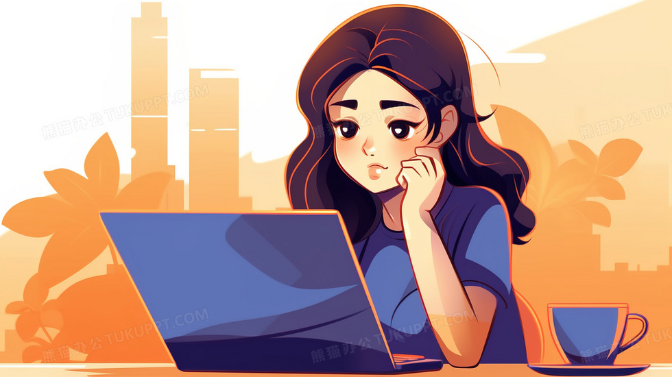 本作品内容为认真看笔记本电脑工作的女生插画, 格式为 jpg, 大小4 MB, 图片尺寸为2912 x 1632, 源文件无水印, 欢迎使用熊猫办公。 如认为平台内容涉嫌侵权,可通过邮件:tousu@tukuppt.com提出书面通知,我们将及时处理。