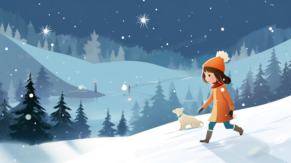 本作品内容为冬季森林雪地里遛狗的女孩插画, 格式为 jpg, 大小4 MB, 图片尺寸为2912 x 1632, 源文件无水印, 欢迎使用熊猫办公。 如认为平台内容涉嫌侵权,可通过邮件:tousu@tukuppt.com提出书面通知,我们将及时处理。