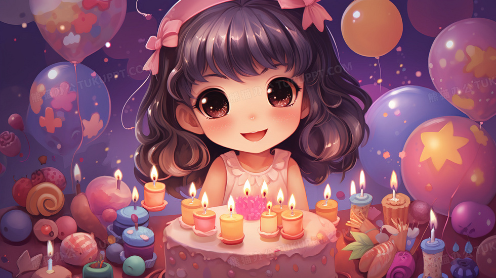 本作品内容为可爱动漫小女孩在生日蛋糕前许愿插画, 格式为 jpg, 大小5 MB, 图片尺寸为2912 x 1632, 源文件无水印, 欢迎使用熊猫办公。 如认为平台内容涉嫌侵权,可通过邮件:tousu@tukuppt.com提出书面通知,我们将及时处理。