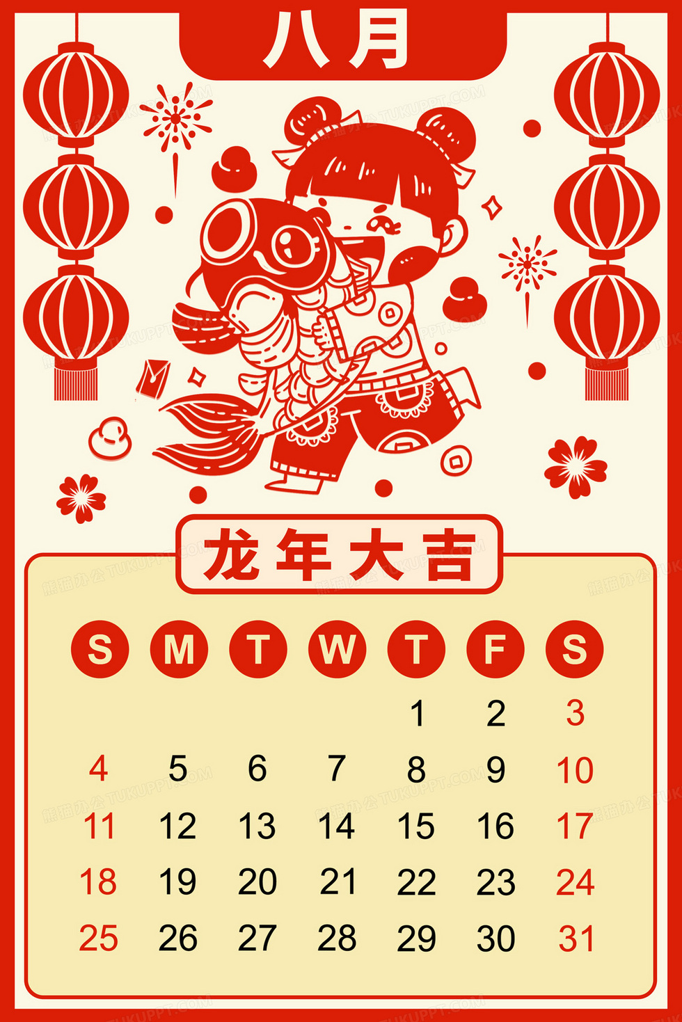 本作品内容为2024龙年年红色剪纸风竖版日历8月插画, 格式为 psd, 大小10 MB, 请使用软件PhotoShop(CC)打开, 源文件无水印, 欢迎使用熊猫办公。 如认为平台内容涉嫌侵权,可通过邮件:tousu@tukuppt.com提出书面通知,我们将及时处理。