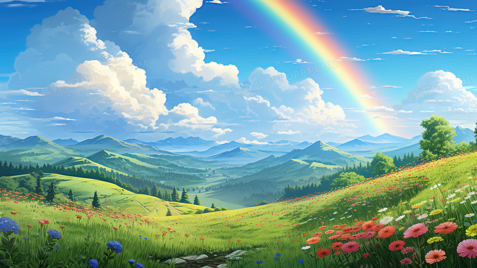 本作品内容为春季山野草地上的彩虹插画, 格式为 jpg, 大小6 MB, 图片尺寸为2912 x 1632, 源文件无水印, 欢迎使用熊猫办公。 如认为平台内容涉嫌侵权,可通过邮件:tousu@tukuppt.com提出书面通知,我们将及时处理。