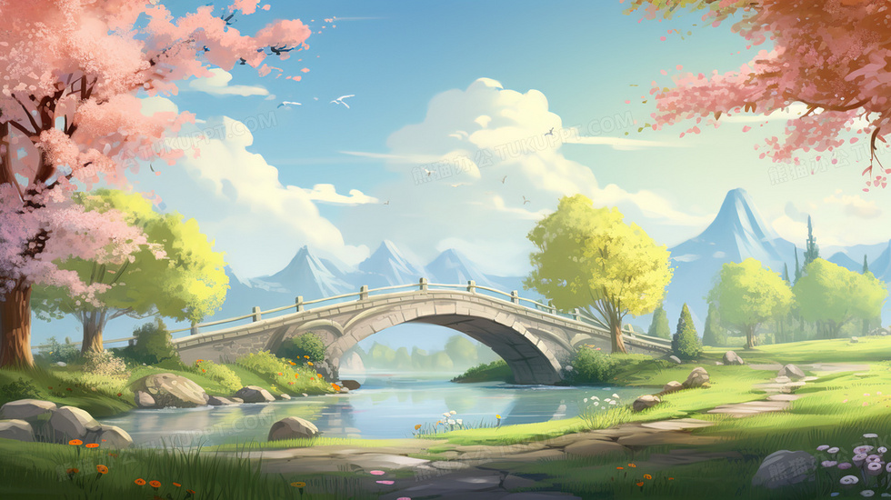 本作品内容为春天山林溪流上的小桥插画, 格式为 jpg, 大小6 MB, 图片尺寸为2912 x 1632, 源文件无水印, 欢迎使用熊猫办公。 如认为平台内容涉嫌侵权,可通过邮件:tousu@tukuppt.com提出书面通知,我们将及时处理。