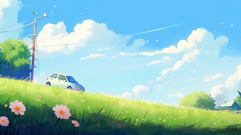 本作品内容为春日大草地上行驶的小车插画, 格式为 jpg, 大小5 MB, 图片尺寸为2912 x 1632, 源文件无水印, 欢迎使用熊猫办公。 如认为平台内容涉嫌侵权,可通过邮件:tousu@tukuppt.com提出书面通知,我们将及时处理。