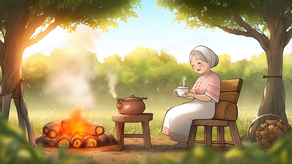 本作品内容为老奶奶坐在院子的火堆旁烧水煮茶创意插画, 格式为 jpg, 大小6 MB, 图片尺寸为2912 x 1632, 源文件无水印, 欢迎使用熊猫办公。 如认为平台内容涉嫌侵权,可通过邮件:tousu@tukuppt.com提出书面通知,我们将及时处理。