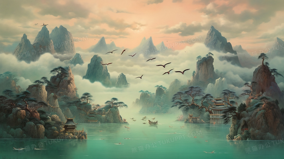 本作品内容为传统中国风古典建筑风景插画, 格式为 jpg, 大小5 MB, 图片尺寸为2912 x 1632, 源文件无水印, 欢迎使用熊猫办公。 如认为平台内容涉嫌侵权,可通过邮件:tousu@tukuppt.com提出书面通知,我们将及时处理。