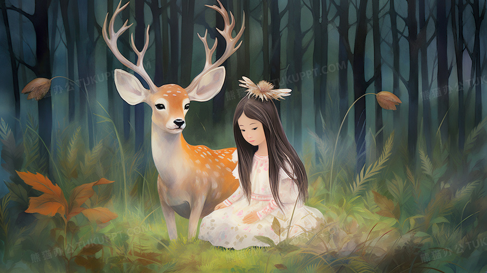 本作品内容为唯美清新麋鹿森林女孩插画, 格式为 jpg, 大小7 MB, 图片尺寸为2912 x 1632, 源文件无水印, 欢迎使用熊猫办公。 如认为平台内容涉嫌侵权,可通过邮件:tousu@tukuppt.com提出书面通知,我们将及时处理。