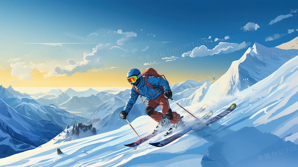 本作品内容为雪山上独自滑雪的人激情运动插画, 格式为 jpg, 大小5 MB, 图片尺寸为2912 x 1632, 源文件无水印, 欢迎使用熊猫办公。 如认为平台内容涉嫌侵权,可通过邮件:tousu@tukuppt.com提出书面通知,我们将及时处理。
