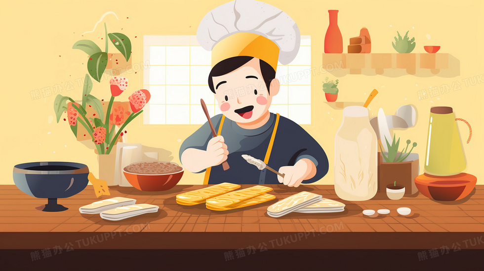 本作品内容为厨房里开心制作美食的厨师插画, 格式为 jpg, 大小4 MB, 图片尺寸为2912 x 1632, 源文件无水印, 欢迎使用熊猫办公。 如认为平台内容涉嫌侵权,可通过邮件:tousu@tukuppt.com提出书面通知,我们将及时处理。