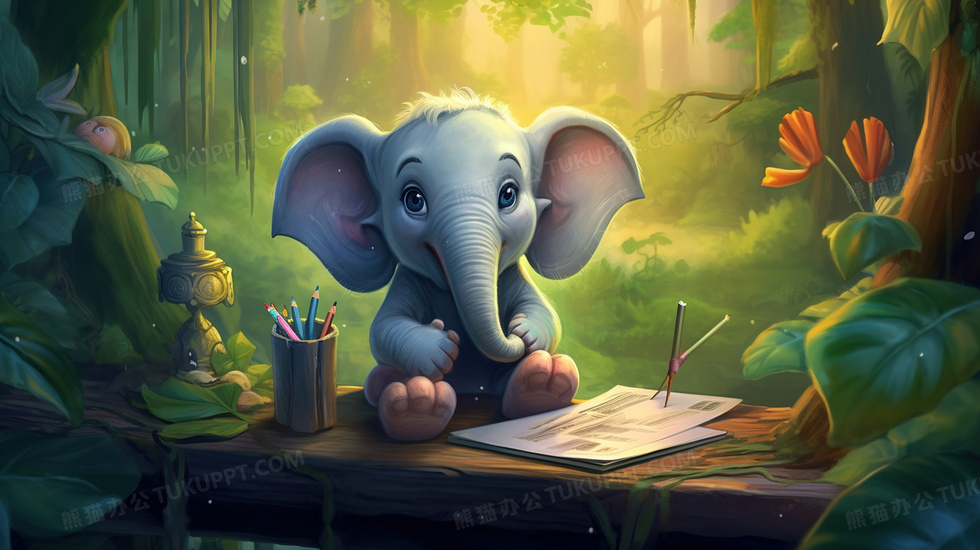 本作品内容为正在学习的卡通森林小象插画, 格式为 jpg, 大小5 MB, 图片尺寸为2912 x 1632, 源文件无水印, 欢迎使用熊猫办公。 如认为平台内容涉嫌侵权,可通过邮件:tousu@tukuppt.com提出书面通知,我们将及时处理。