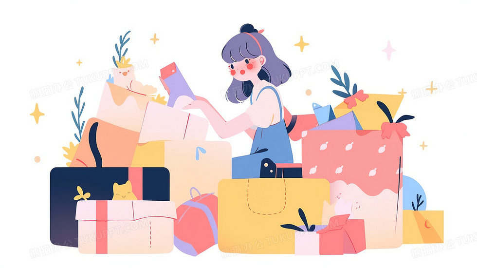 本作品内容为女孩购物买买买拆快递插画, 格式为 jpg, 大小4 MB, 图片尺寸为2912 x 1632, 源文件无水印, 欢迎使用熊猫办公。 如认为平台内容涉嫌侵权,可通过邮件:tousu@tukuppt.com提出书面通知,我们将及时处理。