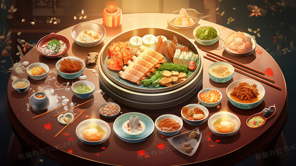 本作品内容为一桌丰盛的团圆饭插画, 格式为 jpg, 大小6 MB, 图片尺寸为2912 x 1632, 源文件无水印, 欢迎使用熊猫办公。 如认为平台内容涉嫌侵权,可通过邮件:tousu@tukuppt.com提出书面通知,我们将及时处理。