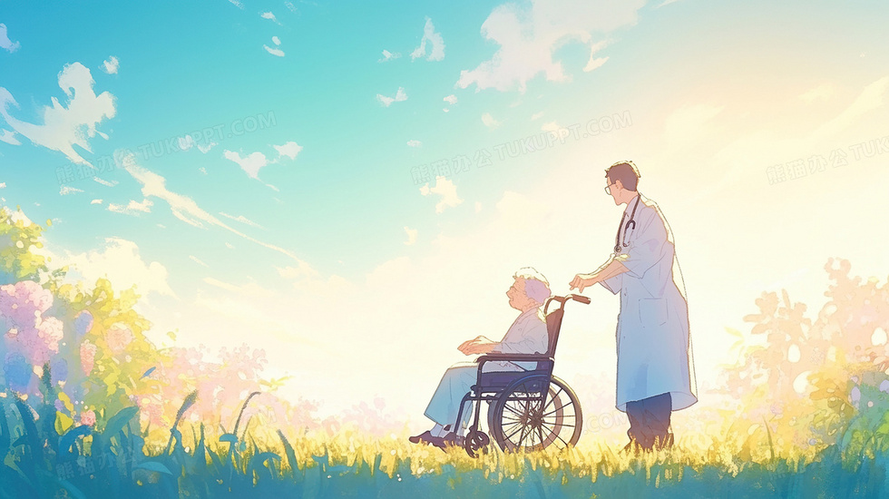 本作品内容为重阳节医生推坐轮椅的老人户外散步插画, 格式为 jpg, 大小3 MB, 图片尺寸为2912 x 1632, 源文件无水印, 欢迎使用熊猫办公。 如认为平台内容涉嫌侵权,可通过邮件:tousu@tukuppt.com提出书面通知,我们将及时处理。