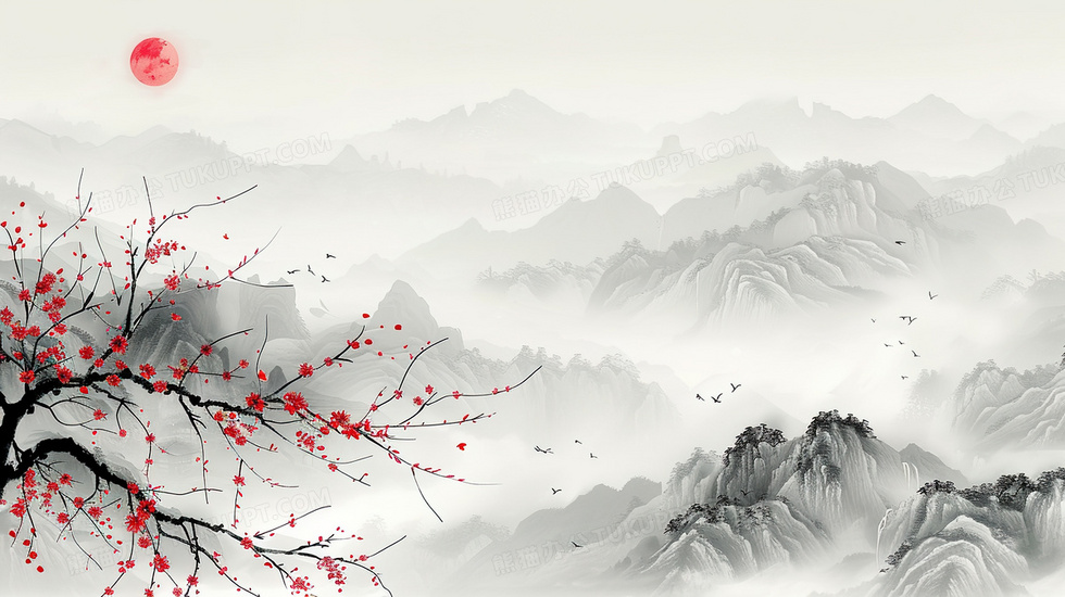 本作品内容为水墨风梅花落日背景, 格式为 jpg, 大小3 MB, 图片尺寸为2912 x 1632, 作品中背景图片无需修改, 源文件无水印,可以直接使用, 欢迎使用熊猫办公。 如认为平台内容涉嫌侵权,可通过邮件:tousu@tukuppt.com提出书面通知,我们将及时处理。