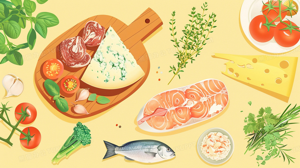本作品内容为桌面上的健康营养美食鱼肉插画, 格式为 jpg, 大小3 MB, 图片尺寸为2912 x 1632, 源文件无水印, 欢迎使用熊猫办公。 如认为平台内容涉嫌侵权,可通过邮件:tousu@tukuppt.com提出书面通知,我们将及时处理。