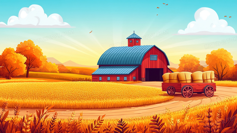 本作品内容为秋季田地里丰收装车的粮食粮仓插画, 格式为 jpg, 大小3 MB, 图片尺寸为2912 x 1632, 源文件无水印, 欢迎使用熊猫办公。 如认为平台内容涉嫌侵权,可通过邮件:tousu@tukuppt.com提出书面通知,我们将及时处理。