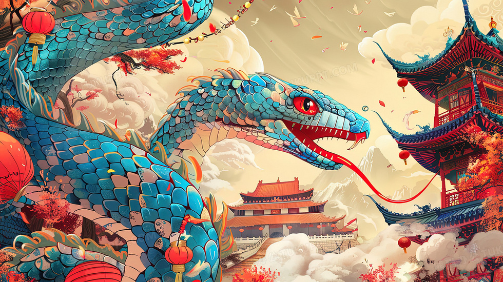 本作品内容为气势磅礴水墨蛇年中式建筑花卉插画, 格式为 jpg, 大小5 MB, 图片尺寸为2912 x 1632, 源文件无水印, 欢迎使用熊猫办公。 如认为平台内容涉嫌侵权,可通过邮件:tousu@tukuppt.com提出书面通知,我们将及时处理。