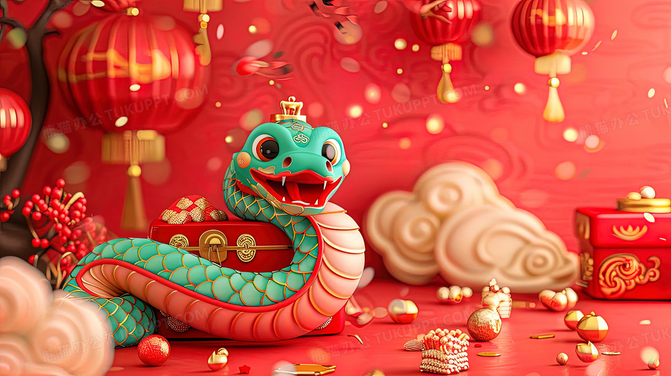 本作品内容为蛇年宝箱金币上爬行的蛇创意插画, 格式为 jpg, 大小3 MB, 图片尺寸为2912 x 1632, 源文件无水印, 欢迎使用熊猫办公。 如认为平台内容涉嫌侵权,可通过邮件:tousu@tukuppt.com提出书面通知,我们将及时处理。