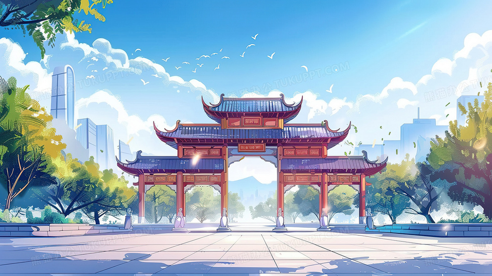 本作品内容为中国古建筑牌坊插画, 格式为 jpg, 大小4 MB, 图片尺寸为2912 x 1632, 源文件无水印, 欢迎使用熊猫办公。 如认为平台内容涉嫌侵权,可通过邮件:tousu@tukuppt.com提出书面通知,我们将及时处理。