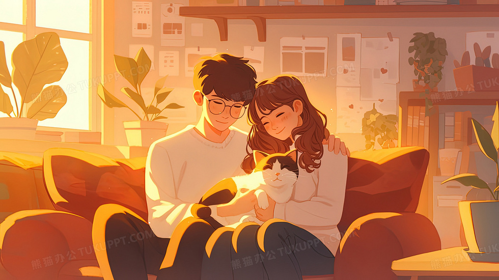 本作品内容为宅家坐沙发撸猫的情侣插画, 格式为 jpg, 大小2 MB, 图片尺寸为2912 x 1632, 源文件无水印, 欢迎使用熊猫办公。 如认为平台内容涉嫌侵权,可通过邮件:tousu@tukuppt.com提出书面通知,我们将及时处理。