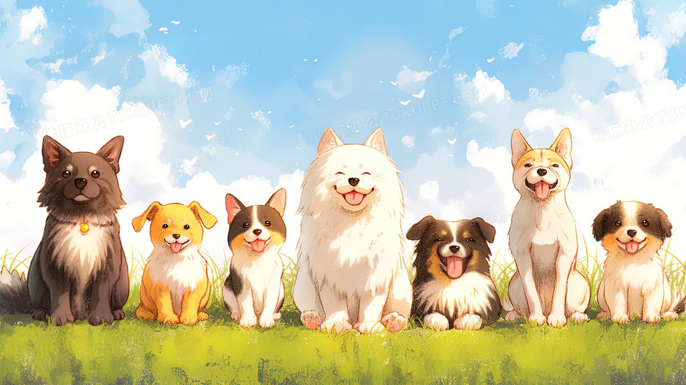 本作品内容为蓝天白云草地上的宠物小狗插画, 格式为 jpg, 大小3 MB, 图片尺寸为2912 x 1632, 源文件无水印, 欢迎使用熊猫办公。 如认为平台内容涉嫌侵权,可通过邮件:tousu@tukuppt.com提出书面通知,我们将及时处理。