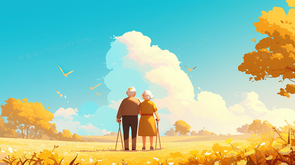 本作品内容为秋天草地散步的老年夫妻插画, 格式为 jpg, 大小2 MB, 图片尺寸为2912 x 1632, 源文件无水印, 欢迎使用熊猫办公。 如认为平台内容涉嫌侵权,可通过邮件:tousu@tukuppt.com提出书面通知,我们将及时处理。
