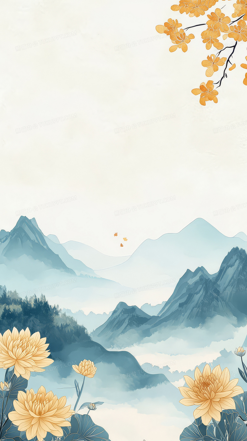 本作品内容为重阳节国画菊花远山背景, 格式为 jpg, 大小6 MB, 图片尺寸为1632 x 2912, 作品中背景图片无需修改, 源文件无水印,可以直接使用, 欢迎使用熊猫办公。 如认为平台内容涉嫌侵权,可通过邮件:tousu@tukuppt.com提出书面通知,我们将及时处理。