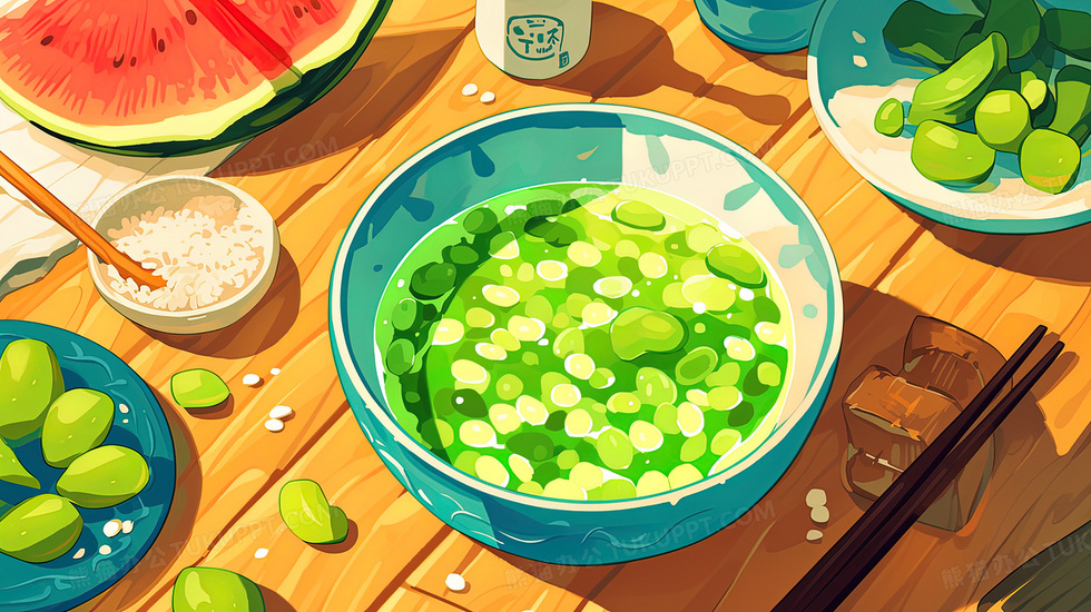 本作品内容为炎热大暑桌上的消暑美食绿豆汤插画, 格式为 jpg, 大小6 MB, 图片尺寸为2912 x 1632, 源文件无水印, 欢迎使用熊猫办公。 如认为平台内容涉嫌侵权,可通过邮件:tousu@tukuppt.com提出书面通知,我们将及时处理。