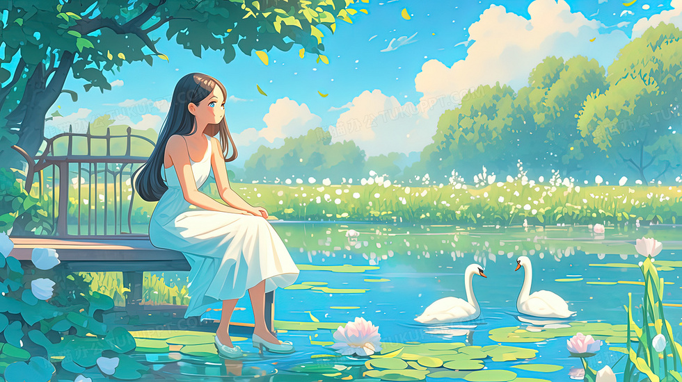 本作品内容为夏天坐在池塘看天鹅的少女插画, 格式为 jpg, 大小6 MB, 图片尺寸为2912 x 1632, 源文件无水印, 欢迎使用熊猫办公。 如认为平台内容涉嫌侵权,可通过邮件:tousu@tukuppt.com提出书面通知,我们将及时处理。