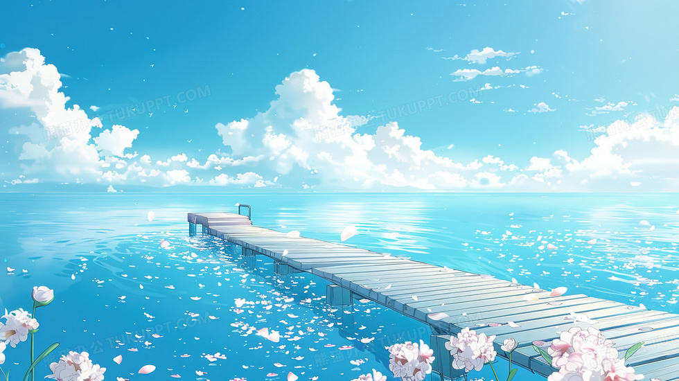 本作品内容为蓝天白云海边栈桥花瓣意境插画, 格式为 jpg, 大小3 MB, 图片尺寸为2912 x 1632, 源文件无水印, 欢迎使用熊猫办公。 如认为平台内容涉嫌侵权,可通过邮件:tousu@tukuppt.com提出书面通知,我们将及时处理。