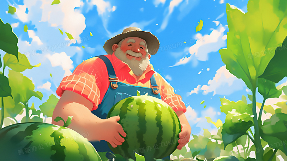 本作品内容为夏季农田丰收西瓜的农民老人插画, 格式为 jpg, 大小3 MB, 图片尺寸为2912 x 1632, 源文件无水印, 欢迎使用熊猫办公。 如认为平台内容涉嫌侵权,可通过邮件:tousu@tukuppt.com提出书面通知,我们将及时处理。