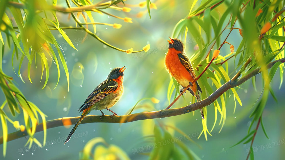 本作品内容为蓝天白云树枝上的两只小鸟插画, 格式为 jpg, 大小3 MB, 图片尺寸为2912 x 1632, 源文件无水印, 欢迎使用熊猫办公。 如认为平台内容涉嫌侵权,可通过邮件:tousu@tukuppt.com提出书面通知,我们将及时处理。